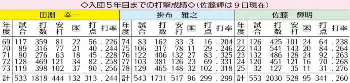 ○…佐藤輝(神)は通算95本塁打、341打点。阪神でプロ5年目までに放った本塁打では、田淵幸一(132本)、掛布雅之(96本)に次ぐ3位としている。同じく5年目までの打点は、これまで最多だった大山の318を抜き球団トップを更新中。巨人・王貞治が高卒5年目終了時の340打点も上回っている。