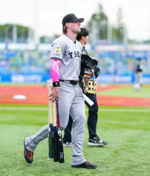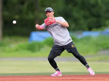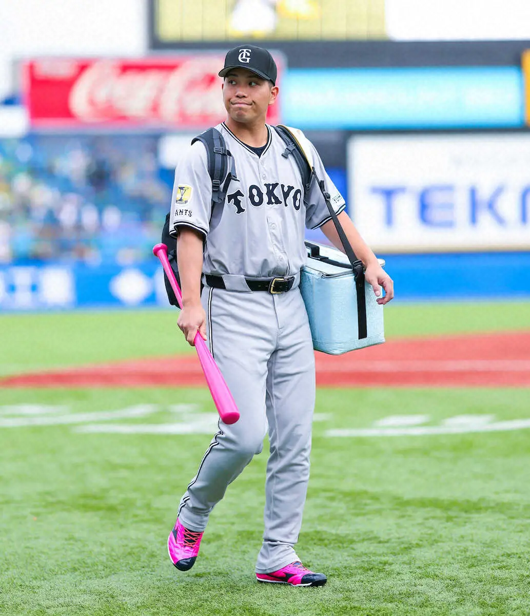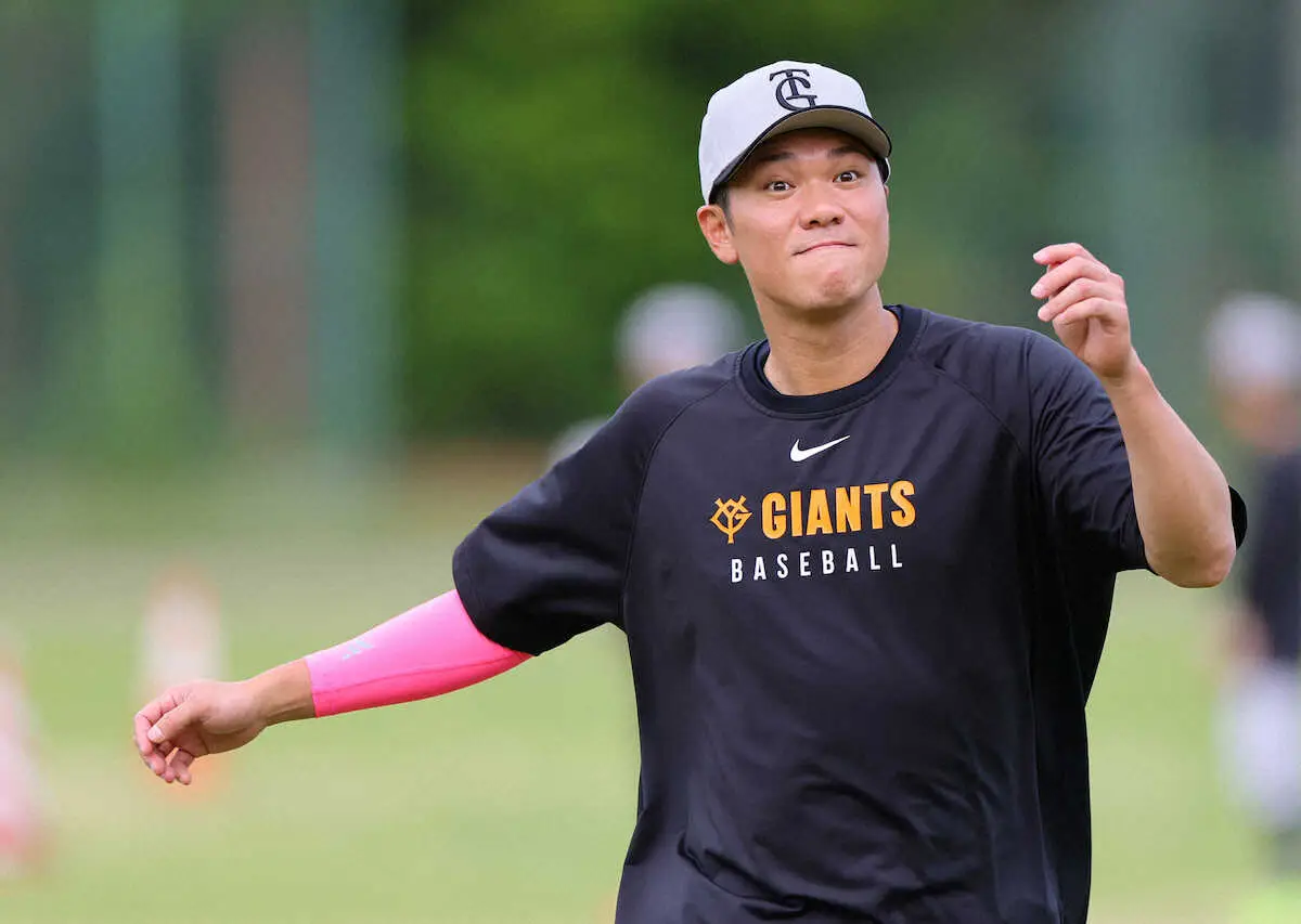 <ヤ・巨>ピンクのアームガードでを着ける吉川(撮影・光山 貴大)