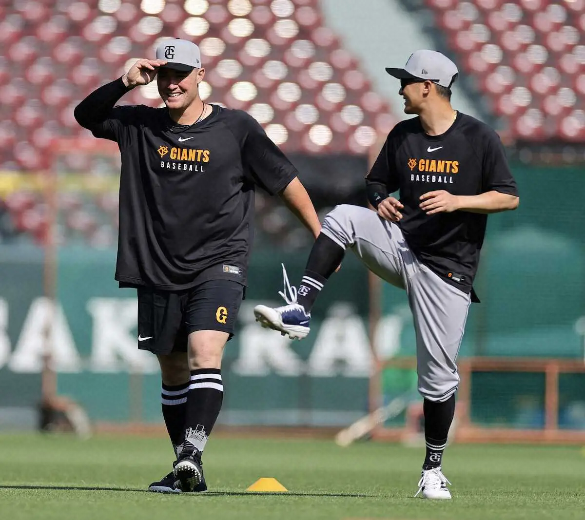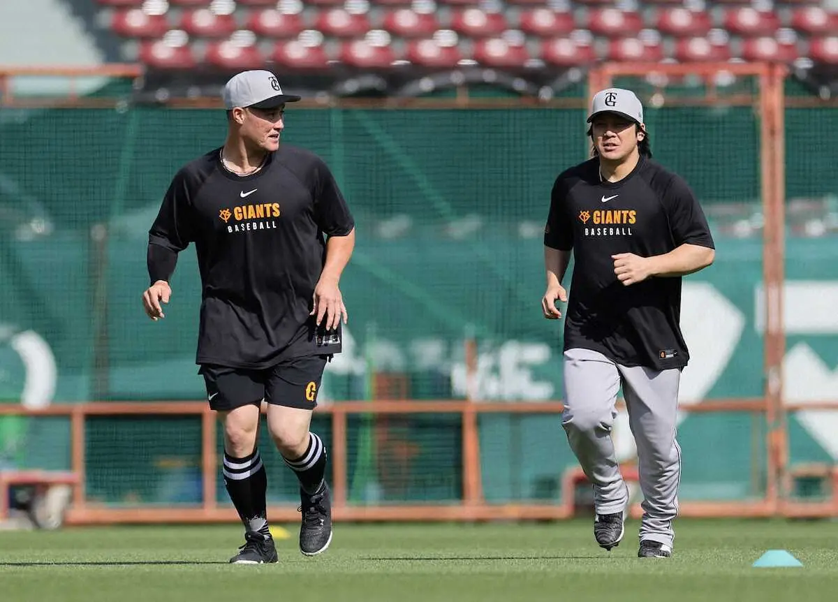<広・巨>吉川(右)と話をしながらウオーミングアップをするリチャード(撮影・光山 貴大)