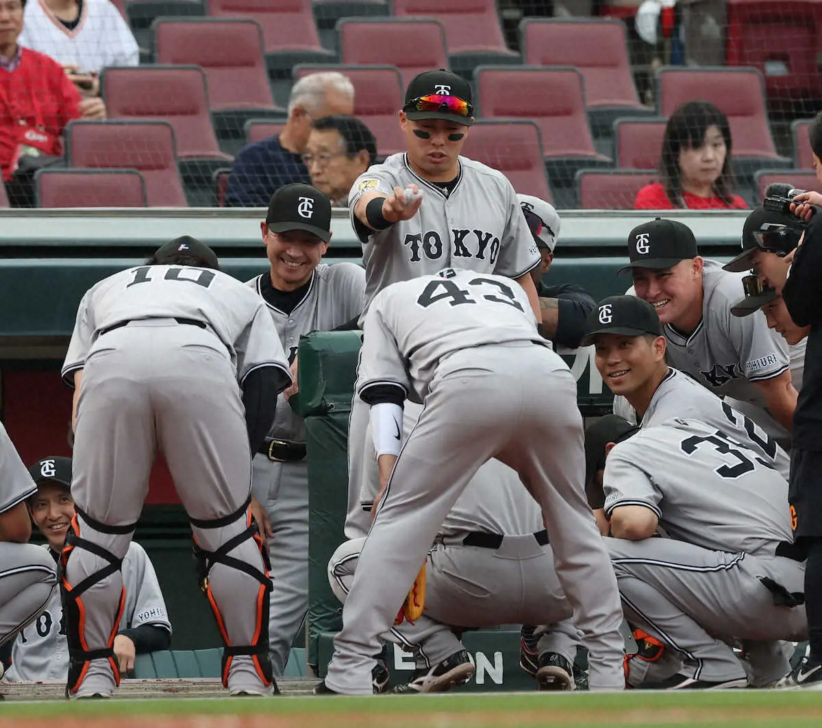 <広・巨>5回、左中間へ本塁打を放ったリチャード(左)を迎える阿部監督(中央)ら(撮影・平嶋 理子)