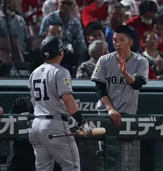 <広・巨>5回、ソロを放ち浅野(右)とタッチを交わすリチャード(撮影・光山 貴大)