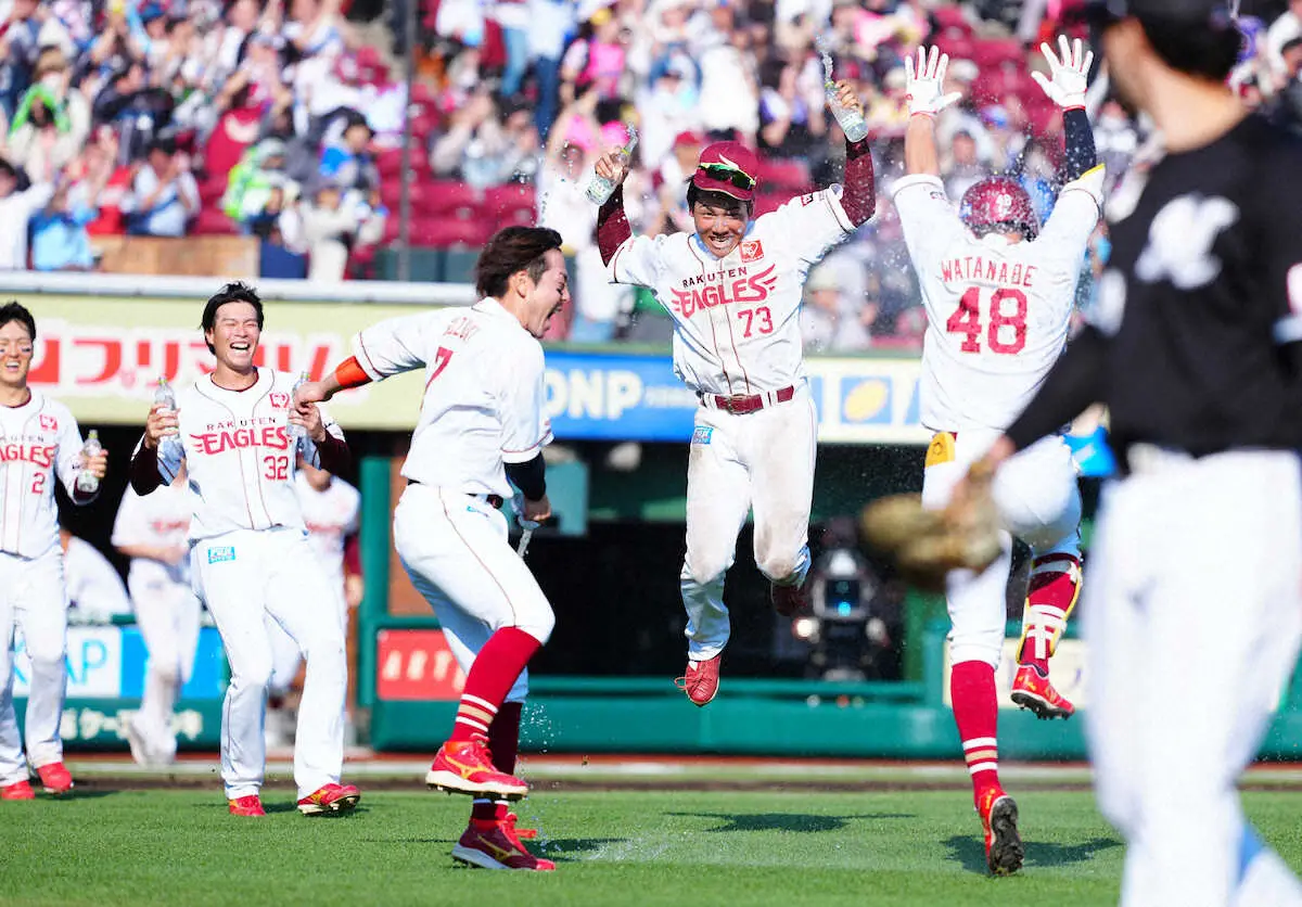 4月27日のソフトバンク戦でもサヨナラ打を放っており、16日ぶりの劇打でチームの連敗を4で止めた。殊勲の28歳は「持ってますね。しかも両方とも代打なんで」と胸を張ったが、サヨナラ男の襲名には「まだ早いっす。みんなが繋いでくれたり、頑張って抑えてくれた結果なので」と照れた。