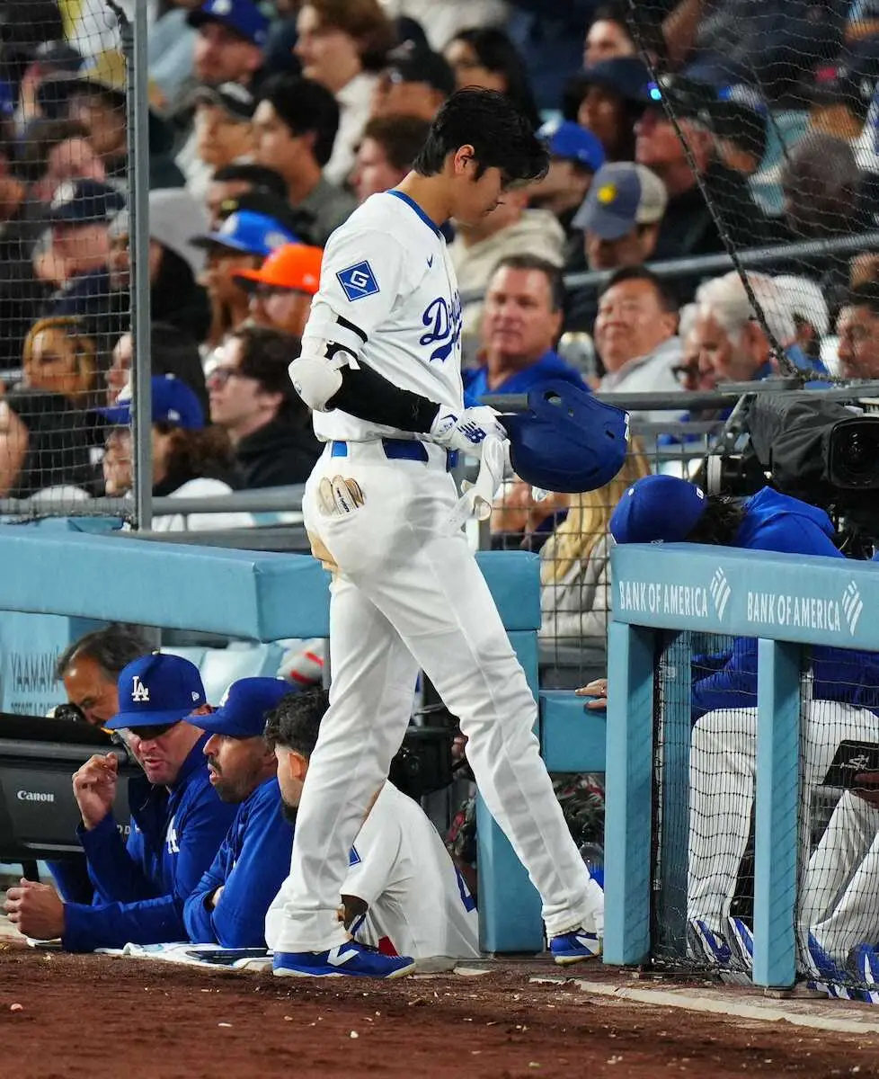 <ドジャース・アスレチックス>5回、ニゴロに打ち取られ、ベンチへ戻る大谷(撮影・木村 揚輔)