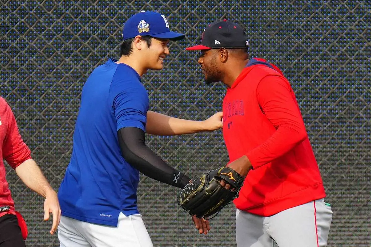 試合前のキャッチボール中にはエンゼルス時代に同僚だったウォードや寺田庸一トレーナーらと談笑する場面があった。キャッチボールを終えると、ドジャース側の左翼側からビジターのエンゼルス側に移動し、かつての同僚や関係者とハグ。一塁側のエンゼルスベンチにも移動し、打撃練習のケージ裏にいた守護神ジャンセンとハグして談笑する場面もあった。エンゼルスとは日本開幕戦後の3月にオープン戦で3連戦を行ったが、シーズンでは今季初対戦となる。