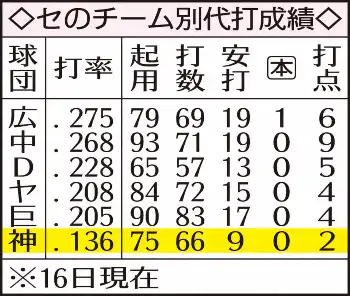 チームの代打成功率は、リーグワーストの・136(66打数9安打)にあえぐ。代打が打点を挙げたのは、糸原と渡辺の計2打点にとどまる。投手の打席で野手を送るケースが多いセ・リーグでは、強力な代打の有無がチームの浮沈を左右しかねない。事実、18年ぶりリーグ制覇をした23年は、右の原口、左の糸原が仕事を果たす試合が目立った。
