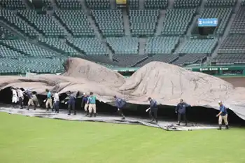 広島戦が予定されている阪神甲子園球場では午前11時半から、試合開催に向けて、グラウンド整備を担当する阪神園芸のスタッフが活動をスタートさせた。前夜からの雨でグラウンド一面を覆っていたカバーの撤収作業が、約50人により始まった。