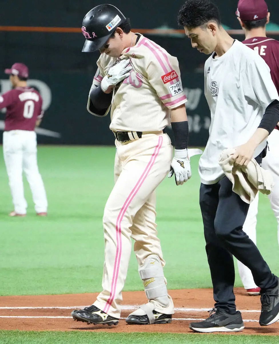 ベンチに戻る際は痛がりながらも笑顔を見せ、小久保監督ら首脳陣と談笑していた。