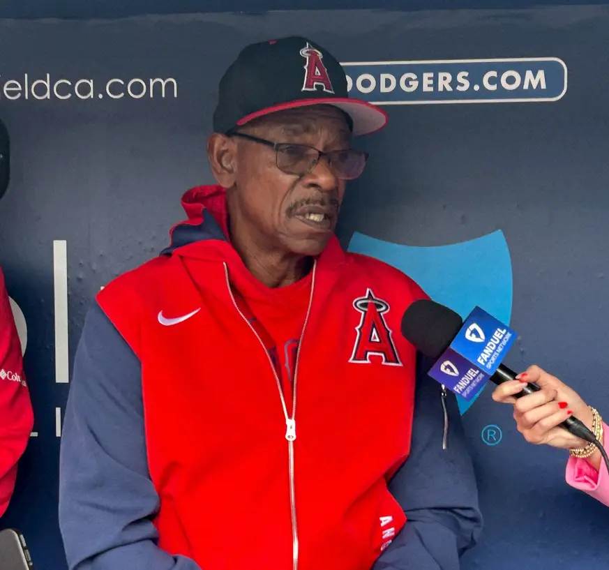 ドジャース戦前に取材に応じるエンゼルス・ワシントン監督(撮影・奥田 秀樹通信員)