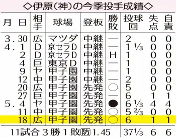 阪神ドラフト1位・伊原が、聖地で躍動を続けている。プロ初先発初勝利を挙げた4月20日に続き、甲子園で広島打線を封じ込めた。