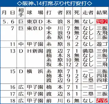 5月の月間打率.086(35打数3安打)でこの試合を迎えた。不振脱出の糸口が見えず「良いきっかけになってくれたら」と願った。チームにとっては、5月6日巨人戦で木浪が放って以来、14打席ぶりの代打安打。この一本が、自身とベンチを勢いづける。(倉世古 洋平)