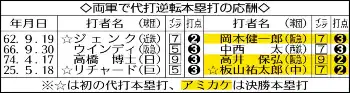 〇…リチャード(巨)と板山(中)がともに代打逆転弾。両軍で代打逆転本塁打の応酬は74年4月17日の阪急―日本ハム戦で9回表に高橋博士(日)が逆転3ラン、その裏に高井保弘(阪急)が逆転サヨナラ2ランを放って以来51年ぶり4度目。セでは初となった。なお、ともにプロ初の代打本塁打が逆転弾の応酬となったのはこの日の2人が初めて。