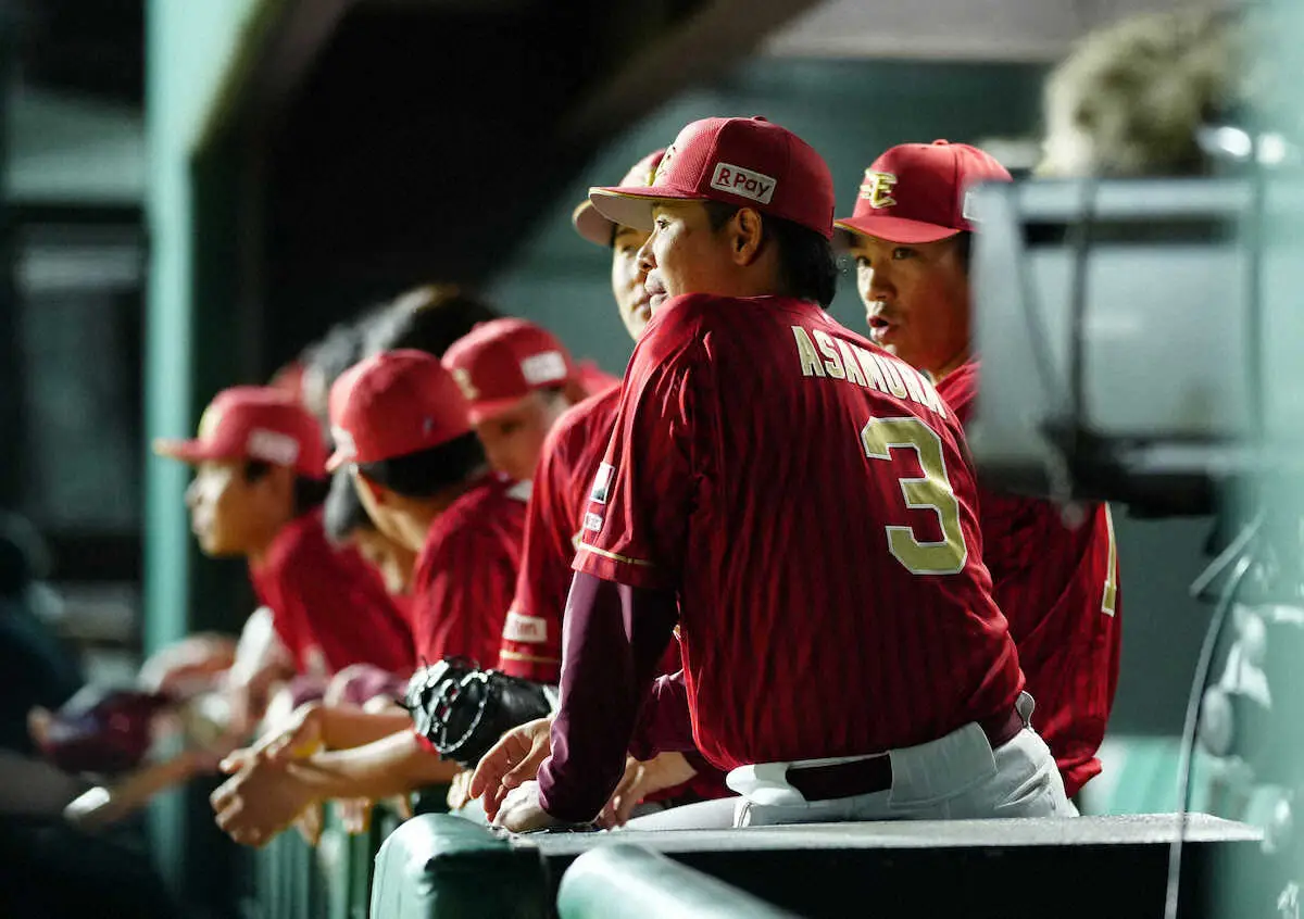 <楽・西5>9回、ベンチで戦況を見つめる浅村(右から2人目)=撮影・小海途 良幹