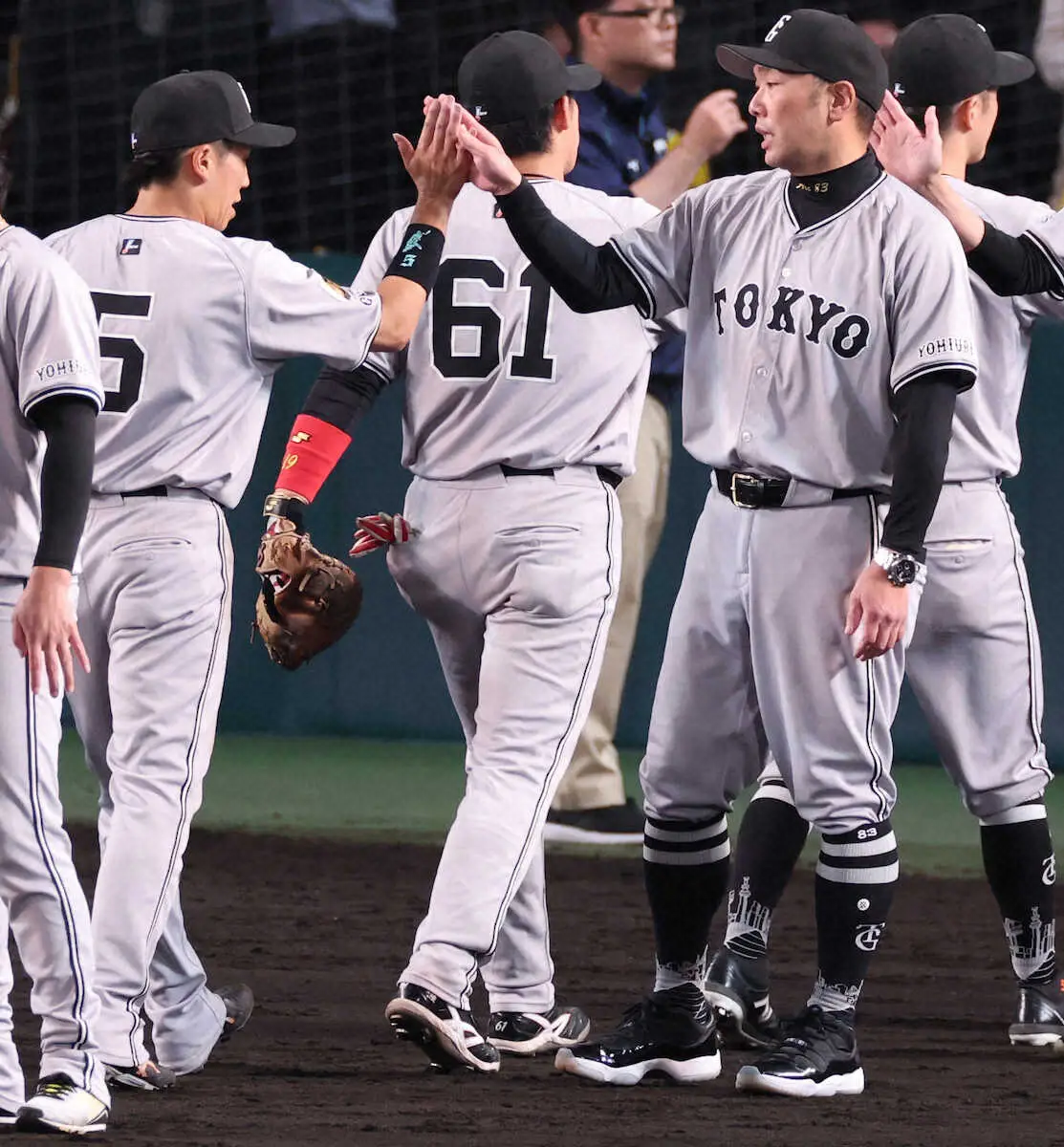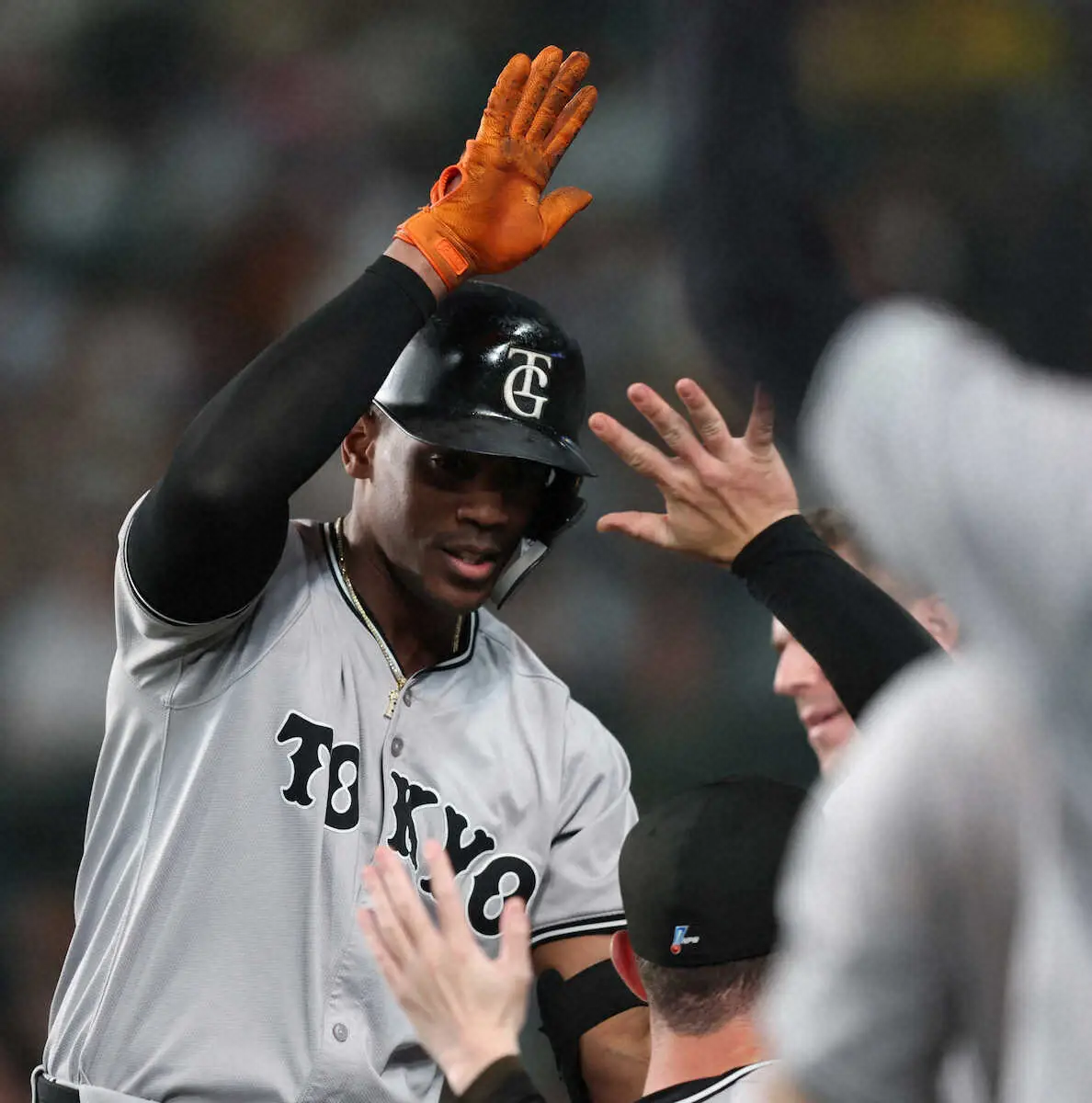 <神・巨>7回、同点ソロ本塁打を放ち、ナインとハイタッチをかわすヘルナンデス(撮影・北條 貴史)
