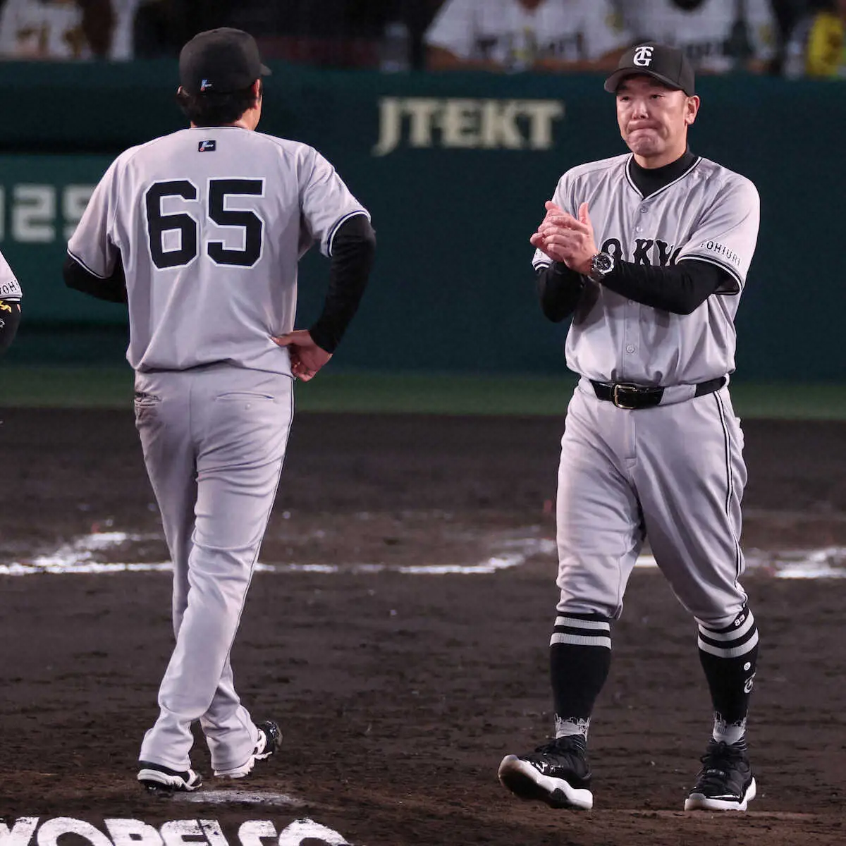 <神・巨>延長戦を制し、門脇(左)とタッチを交わす阿部監督 (撮影・須田 麻祐子)