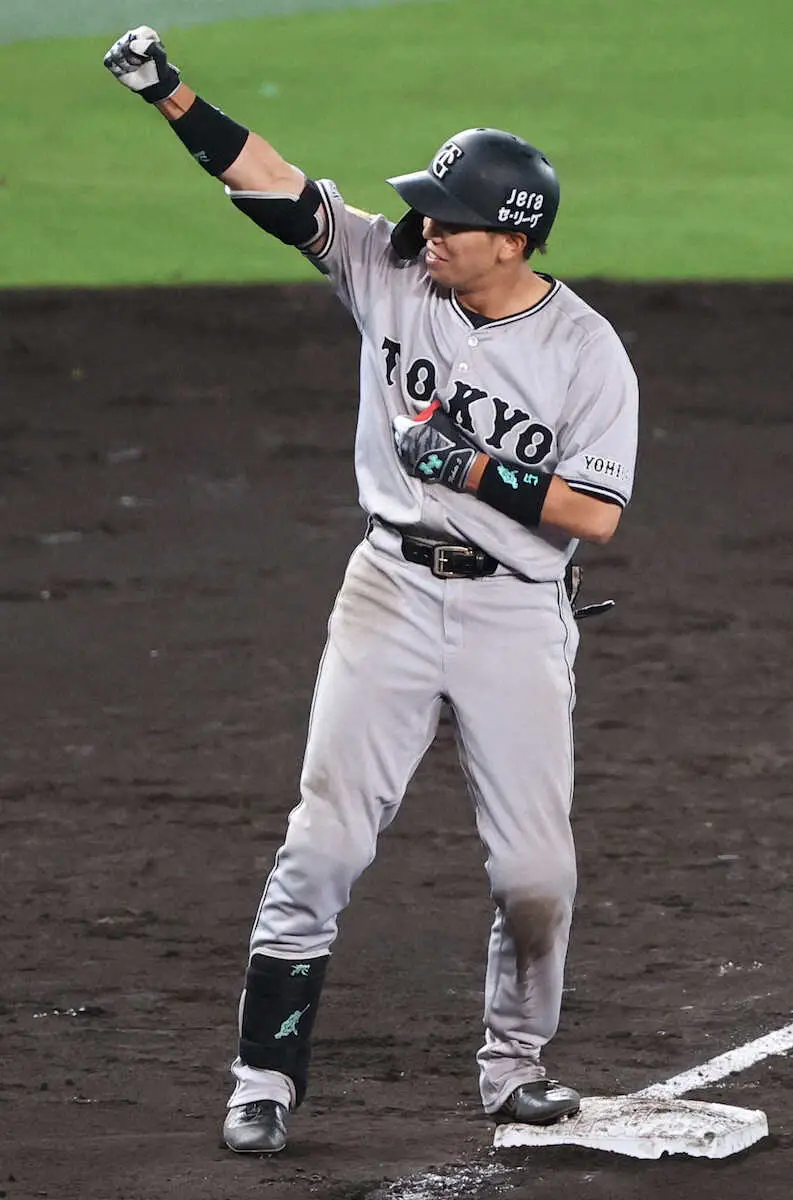 <神・巨>11回、門脇は勝ち越しとなる適時三塁打を放ち、ベンチに向かってガッツポーズ(撮影・椎名 航)