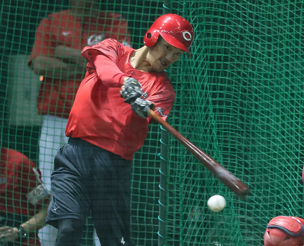 打撃練習する広島・矢野(撮影・岸 良祐)