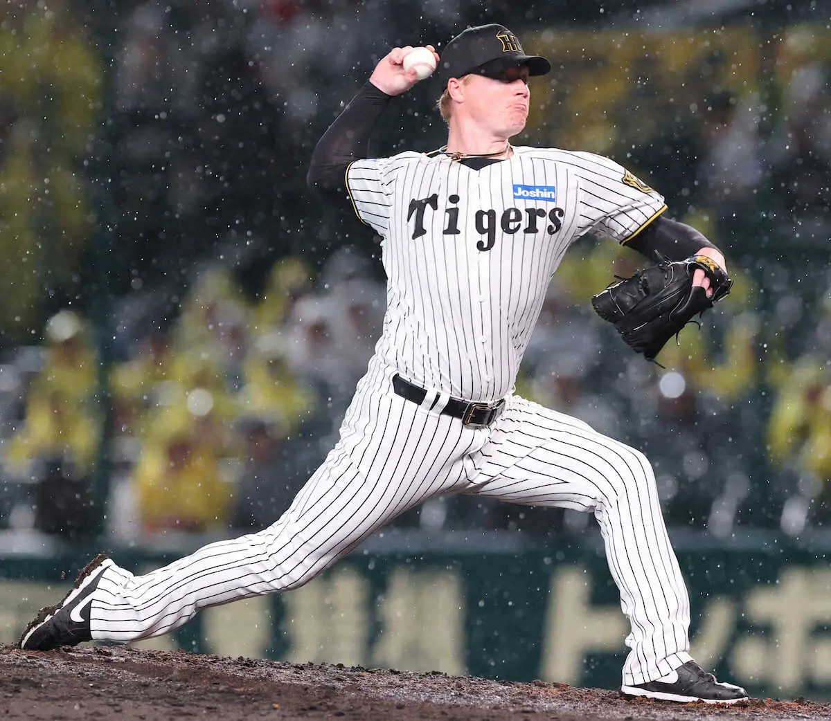 「2つ四球を出して見た目は良くないが、サトウ(佐藤輝)がフライをつかんでくれたときはホッとしたよ」。試合開始から雨が降りしきり、2四球後にタイムをかけて砂を入れるなど、ぬかるんだマウンドに悪戦苦闘。「足もとが良ければもっとスピードは出たかもしれないね」と、この日最速の151キロからさらなるスピードアップに自信を見せた。藤川監督も「きょうのマウンドでリリーバーは厳しかったと思う。少しハードでしたが、最後は腕を振ってくれた」と次回登板に期待した。