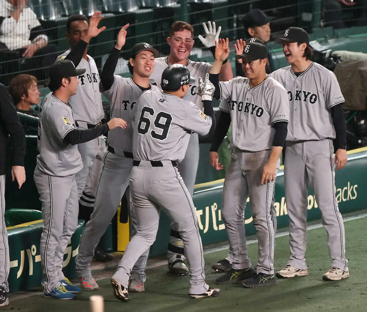 <神・巨>延長11回、門脇の勝ち越し適時三塁打で生還した笹原(69)を迎える巨人ベンチ(撮影・椎名 航)