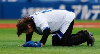 米米CLUB・石井竜也が始球式で2年連続土下座 山なりで外角へ大きく外れるボールで謝罪