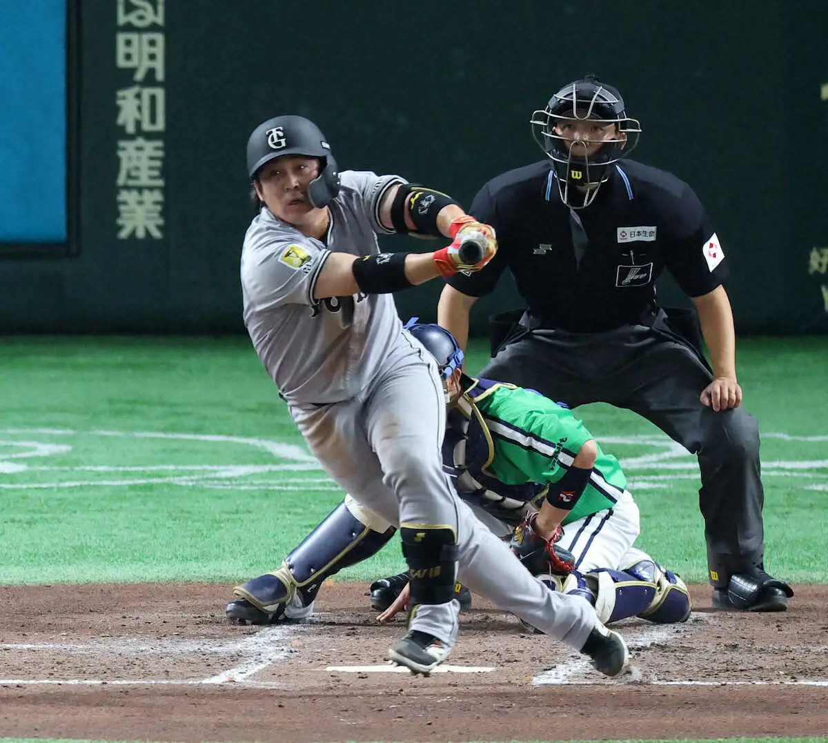 <巨・ヤ>4回、適時打を放つ甲斐(撮影・白鳥 佳樹)