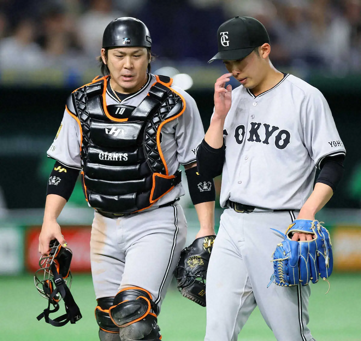 <巨・ヤ>4回、甲斐(左)と話をしながら引き揚げる赤星(撮影・光山 貴大)