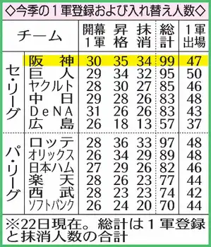 逆に前川右京をはじめ、5選手を抹消してこの日だけで計10選手が1、2軍を行き来した。開幕からまもなく2カ月がたつが、延べ99選手の入れ替えは12球団最多。今季1軍の試合に出場した選手は47人を数える。主力選手の負傷リタイアなど非常事態にある巨人と比べて、首位の阪神の数は目立つが、1年間チーム全員で戦うという藤川監督が掲げた基本方針が守られている。