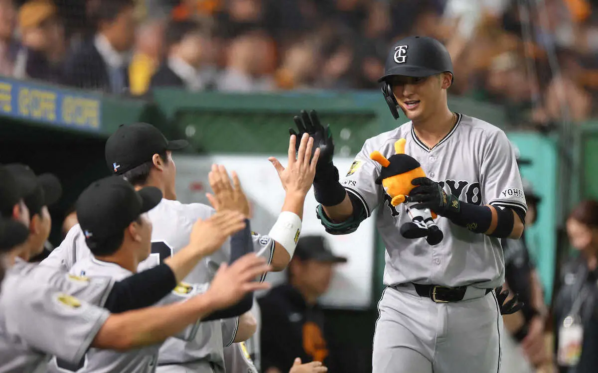 <巨・ヤ(11)>4回、ソロ本塁打を放ちハイタッチする泉口 (撮影・白鳥 佳樹)