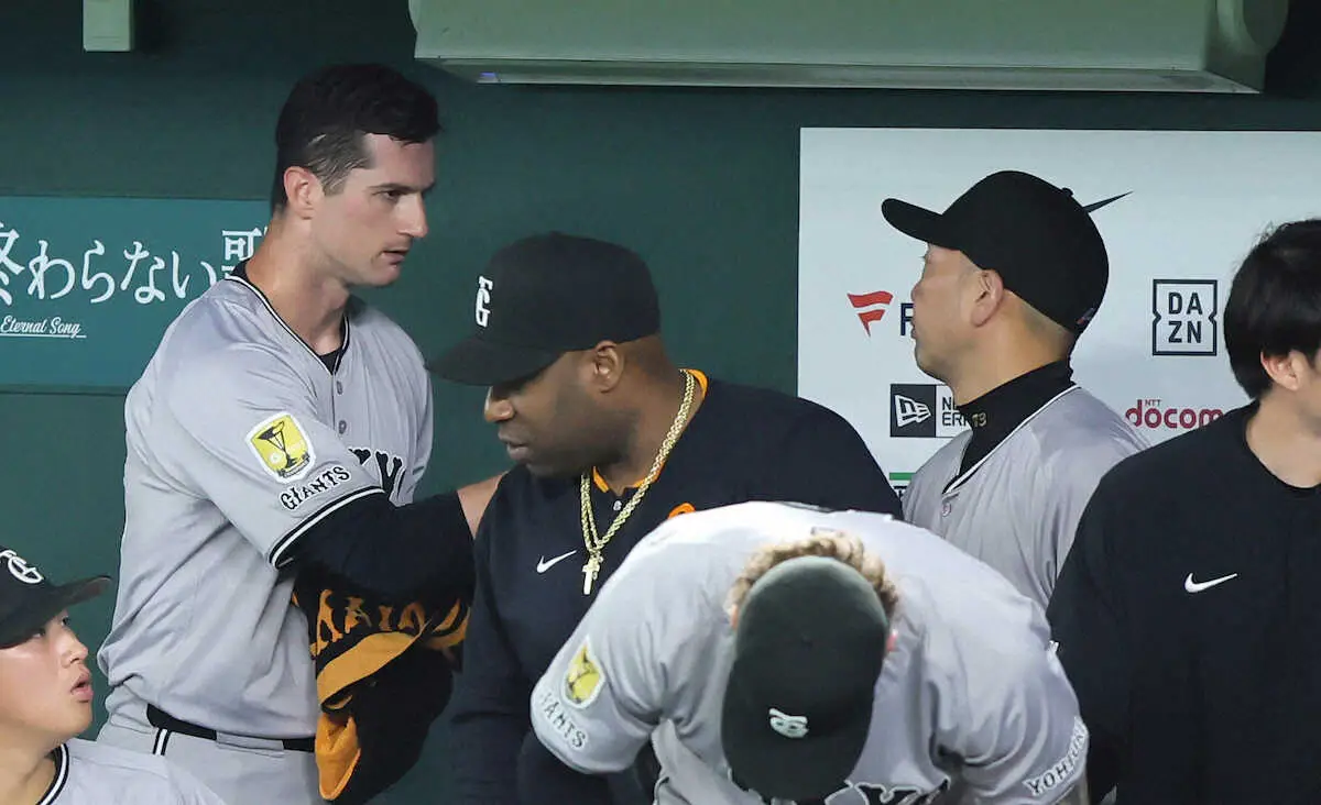 <巨・ヤ>6回を投げ終え、阿部監督(右)からねぎらわれるグリフィン(撮影・尾崎 有希)