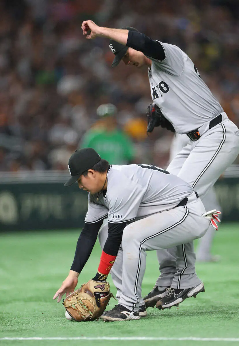 <巨・ヤ>3回、吉村の犠打を処理する増田陸をかわすグリフィン (撮影・白鳥 佳樹)