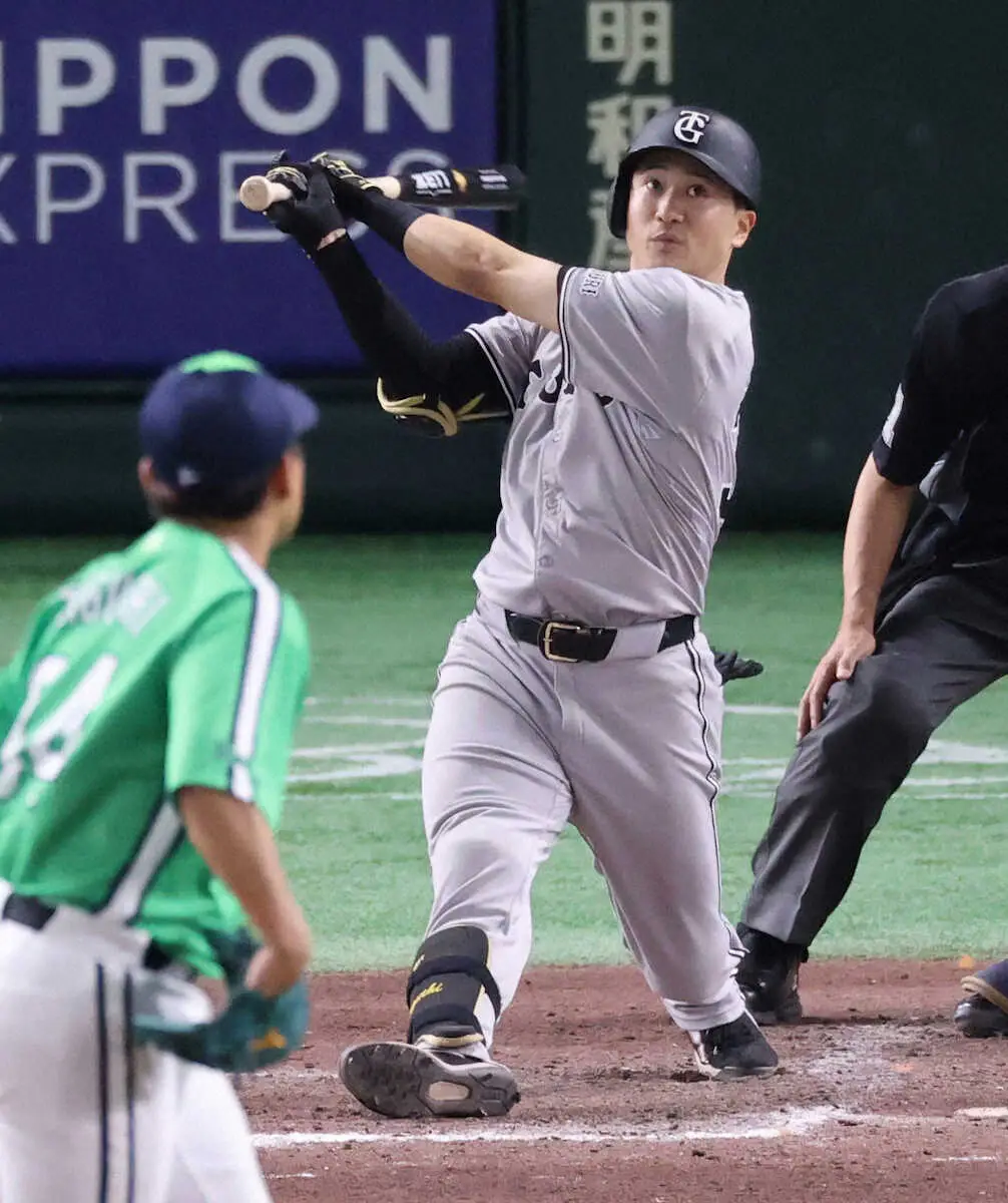 <巨・ヤ>8回、泉口が勝ち越し2点適時二塁打を放つ(撮影・村上 大輔)