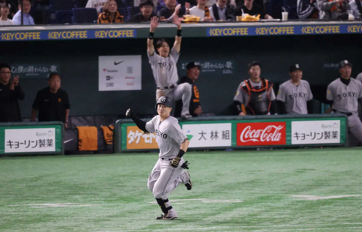 <巨・ヤ>8回、適時二塁打を放ちガッツポーズする泉口(撮影・白鳥 佳樹)