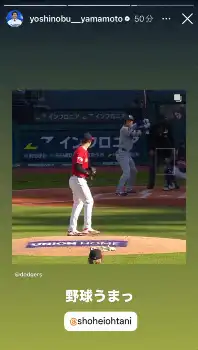 山本は自身の投球動画だけでなく、大谷が先頭打者アーチを放つ動画を投稿。大谷の動画には下部に「野球うまっ」と記し、先輩を称えた。