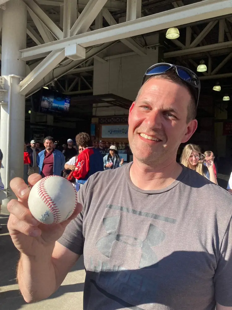 大谷翔平の19号本塁打ボールをゲットしたニック・ラムさん(撮影・杉浦 大介通信員)