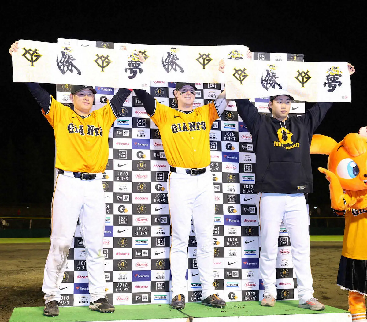 <巨・広(11)>お立ち台でてぬぐいを掲げる(左から)増田陸、キャベッジ、山崎(撮影・光山 貴大)