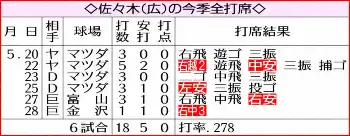 1軍で結果を出すために、25日のDeNA戦から打席での意識を変えた。それまでは、直球と並行して相手投手が武器とする変化球も待っていたというが、朝山、小窪両打撃コーチから「変化球を待って直球対応は1年目の打者には難しい」と助言を受けた。「今は、まだ技術もないですし、その待ち方はやめようと。一番速い球に合わせてというところをやっている」と佐々木。シンプルに狙いを定め、打席の中で対応力を磨く構えだ。