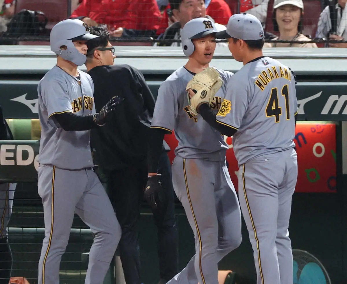 森下翔太が打ち上げた飛球は左翼前に上がった。広島左翼手サンドロ・ファビアンが声と動作で自分が捕ると示していた。そこに猛然と遊撃手・矢野雅哉が深追いし突っ込んできた。衝突し白球は緑の芝生に弾んだ。