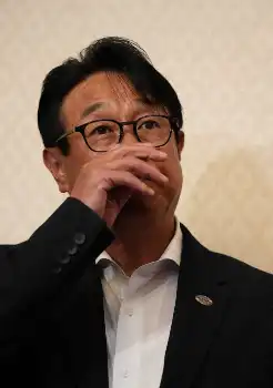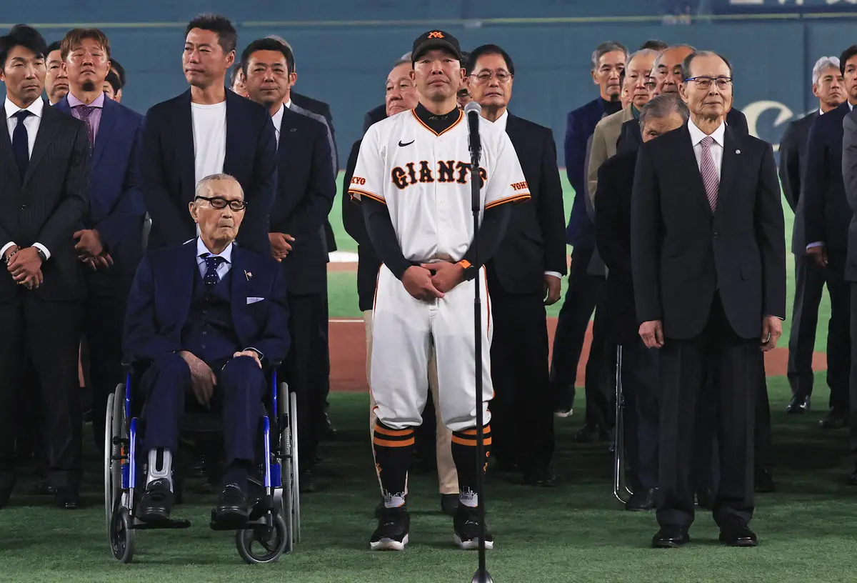 24年11月のジャイアンツファンフェスタで整列する巨人・阿部監督(中央)と長嶋茂雄さん(左)