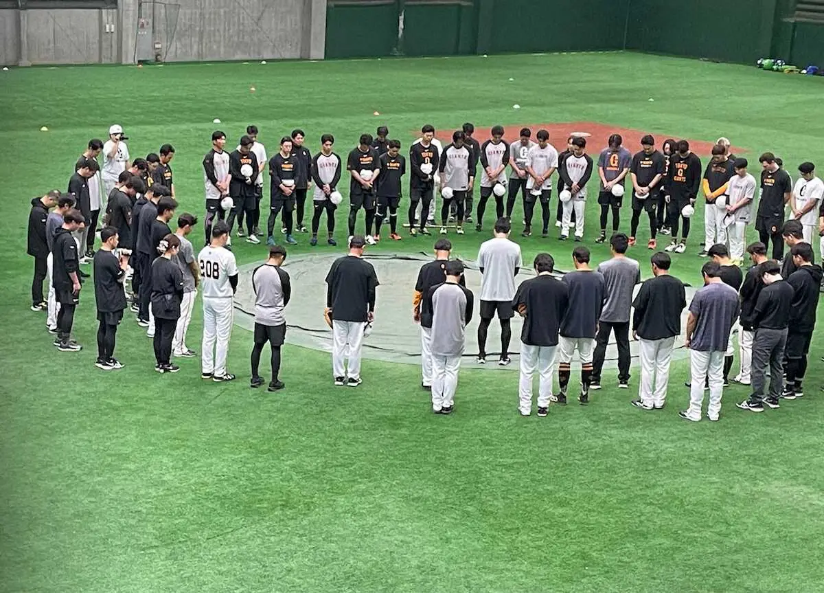 巨人の2軍選手は練習前に黙祷をささげた