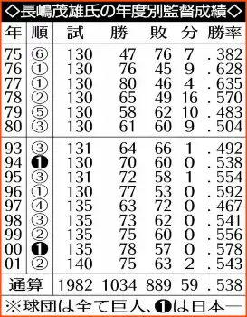 74年の現役引退後は巨人の監督として2度の日本一を含む5度のリーグ優勝。94年の中日との「10・8決戦」は「国民的行事」と表現し、社会現象となった。ヤンキースでも活躍した松井秀喜を育成。01年の勇退後はアテネ五輪の日本代表監督に就任したが、脳梗塞で倒れ、04年本大会での指揮は断念した。病魔と闘いながら願っていたのが愛弟子・松井氏が監督となる姿を見ること。「いずれ監督として日米の教えを取り入れた野球をやってほしい」。そう言って楽しみにしていたが、かなわなかった。