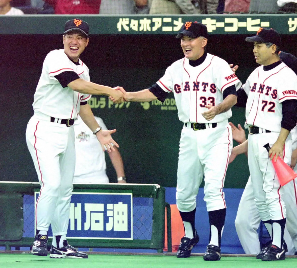 「野球界の象徴。私にとっては神様みたいな存在」。選手時代だけでなく、コーチとしても指導を受けた。動物的ひらめきで戦う指揮官に細かい指示はされず、失敗も責められない。「うーん」の一言で答えが明かされないことも、自身の提示した作戦が受け入れられているか悩んだこともあった。だが、ヘッドコーチだった01年のシーズン最終盤に監督室をノックすると、直立不動で迎えた長嶋監督から「おめでとう!来年から原監督だ」と右手を差し出され、02年から後を継いだ。