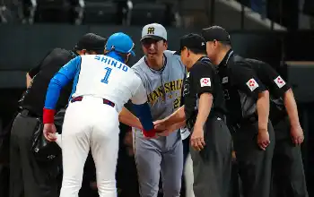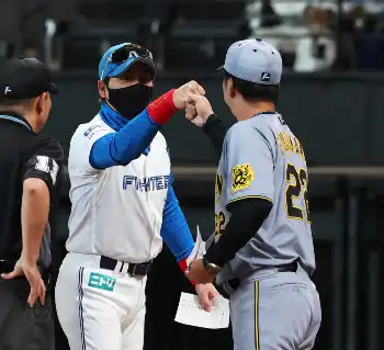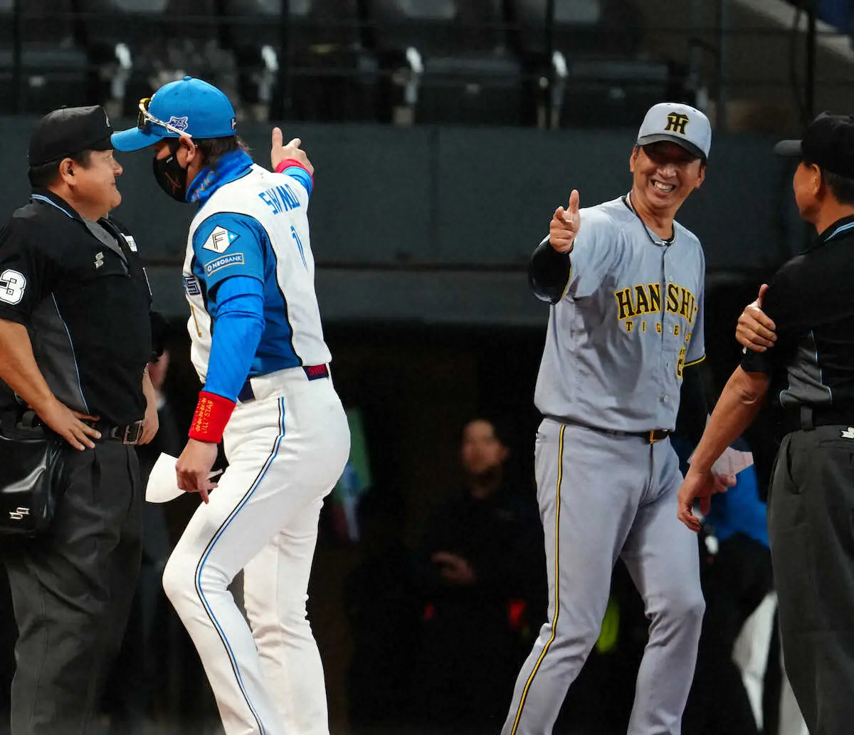 【画像・写真】異例の光景にどよめき→爆笑!日本ハム“新庄劇場第3弾”藤川監督だけでなく審判団も巻き込み円陣タッチ!