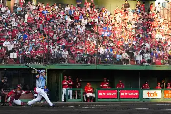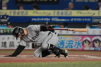 <交流戦 ロ・巨2>6回、自打球が当たり打席で転倒する若林(撮影・沢田 明徳)