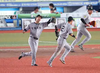 <ロ・巨>5回、吉川尚は同点ソロを放ちナインの出迎えを受ける(撮影・沢田 明徳)
