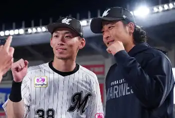 <ロ・巨(2)>6回、ロッテ打線を封じて吉川とグラブタッチする山崎 (撮影・白鳥 佳樹)