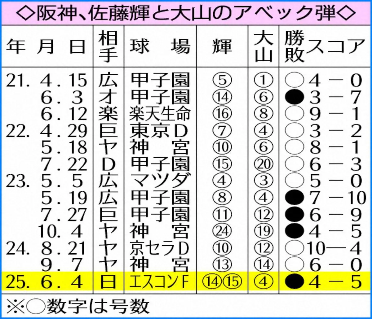 ○…4番・佐藤輝と5番・大山が4回に本塁打競演。2人のアベック弾は24年9月7日ヤクルト戦以来13度目で、2者連発は23年10月4日ヤクルト戦初回の4番・大山→5番・佐藤輝以来2年ぶり2度目。