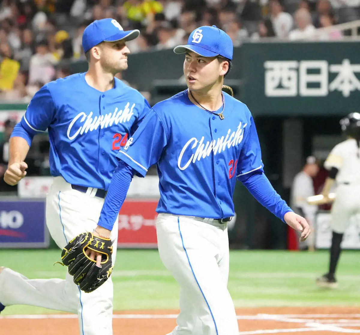 <ソ・中>6回を投げ終えベンチに戻る金丸(撮影・岡田 丈靖)
