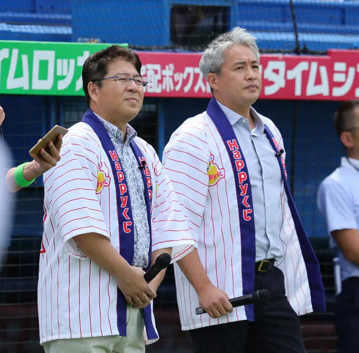 「めくってハッピー!Happyくじデー」が開催され、試合前にヤクルトOBの真中満氏と五十嵐亮太氏がファーストピッチセレモニーで1打席対決。五十嵐氏がマウンドの前から、往年の剛球ではなく山なりのボールを投じたが「1球で仕留めてくれるかと思ったら、真中さん力はいっちゃって」と2球ファウル。たまりかねて五十嵐氏が近づいてトスし、ようやく真中氏が往年のバットコントロールで中前へはじき返した。