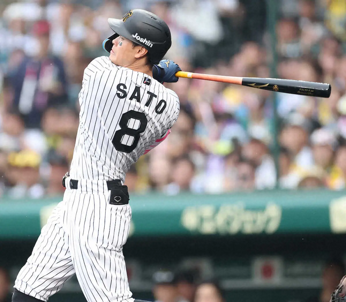 関西ダービー3連勝を締めくくったのは8回の佐藤輝の17号グランドスラム。1死二、三塁で森下を申告敬遠したオリックスの選択に、4番の意地をぶつけた。「一発行ったろという気持ちで行きました」とバックスクリーン右に打球をたたき込んだ。
