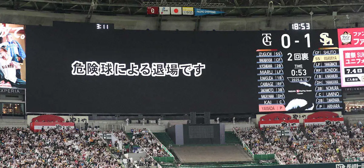 場内のビジョンには「危険球による退場です」との文字が掲示された。