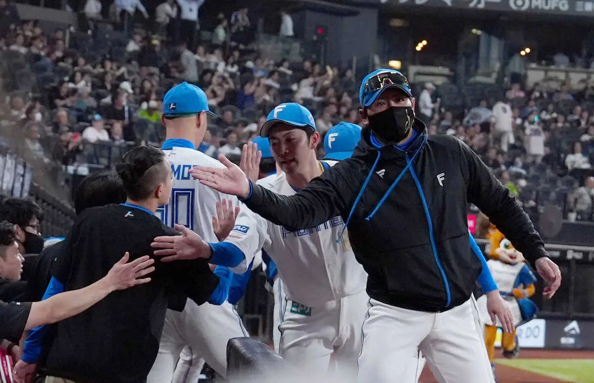 <日・ヤ(1)>コーチらと勝利のハイタッチを交わす新庄監督(撮影・高橋 茂夫)